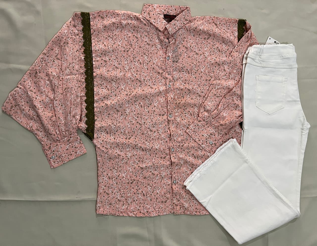 Stay stylish and comfortable with this baggy floral printed cotton shirt paired with a classic white denim pant. The loose-fit shirt in pastel pink comes with button-down style, long sleeves, and lace detailing, giving it a chic and trendy look. The white denim pant with frayed hem completes the outfit, making it perfect for casual outings, daily wear, or semi-formal occasions.