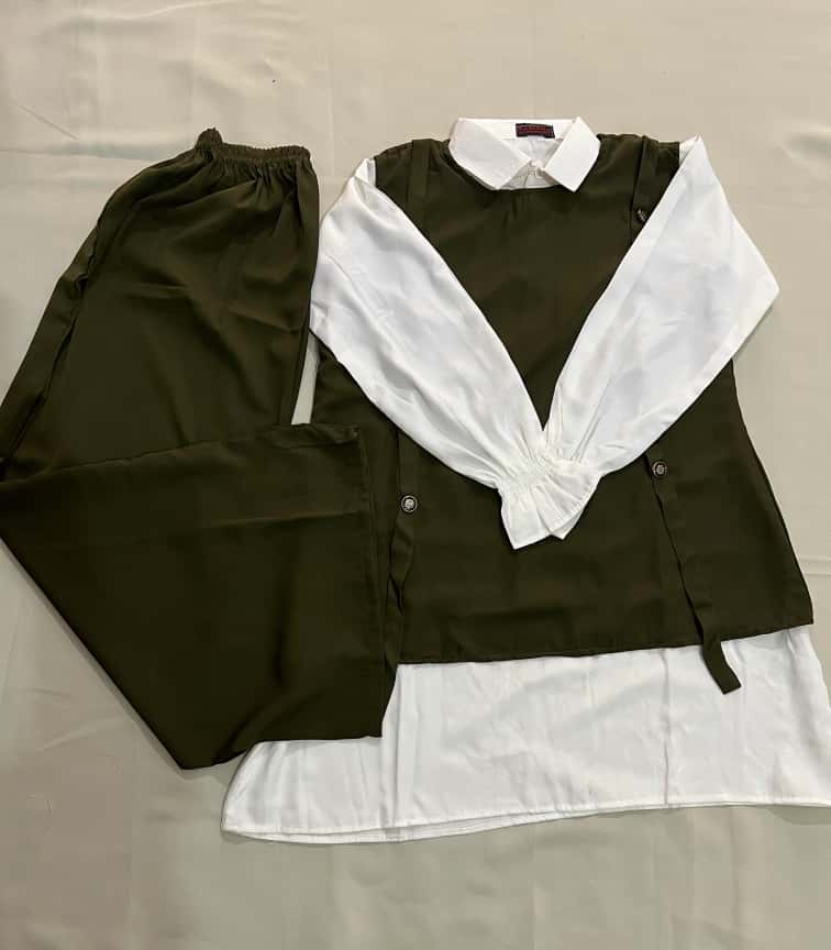 Redefine elegance with this 3-piece modest wear outfit featuring a classic white shirt, a moss color skirt, and a stylish long buttoned vest. The crisp white shirt with full sleeves gives a polished look, while the moss skirt ensures comfort with its elastic waistband. The long sleeveless vest with button detailing adds a fashionable layering touch, making this outfit perfect for office wear, formal gatherings, and everyday chic style.