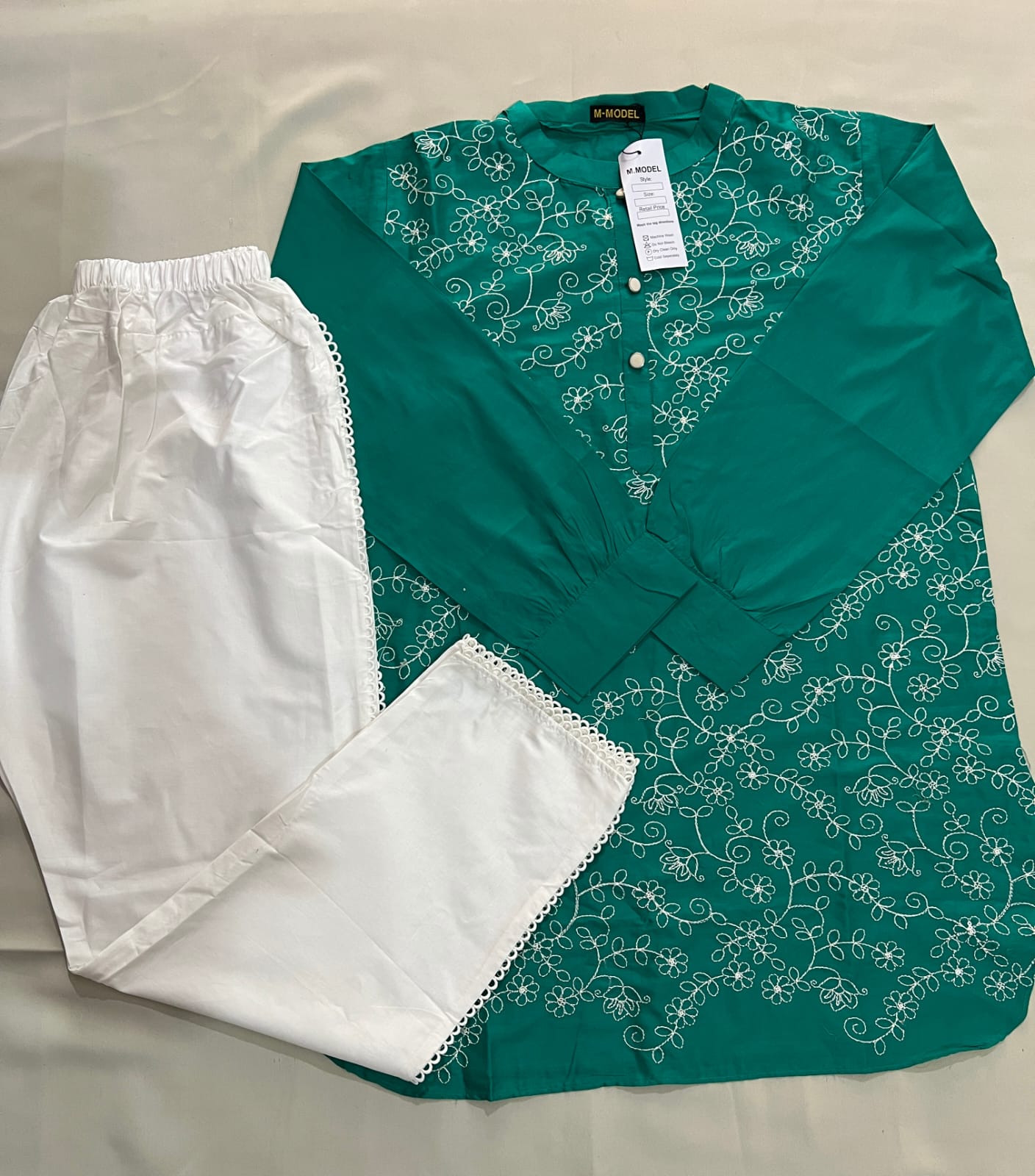 Upgrade your everyday look with this 2-piece stylish outfit featuring a premium cotton embroidered shirt and cotton trouser. The shirt comes with beautiful bird and floral embroidery, tassel detailing on the neckline, and full sleeves – perfect for casual and semi-formal occasions. The denim pant is soft, comfortable, and easy to wear with its elastic waistband.